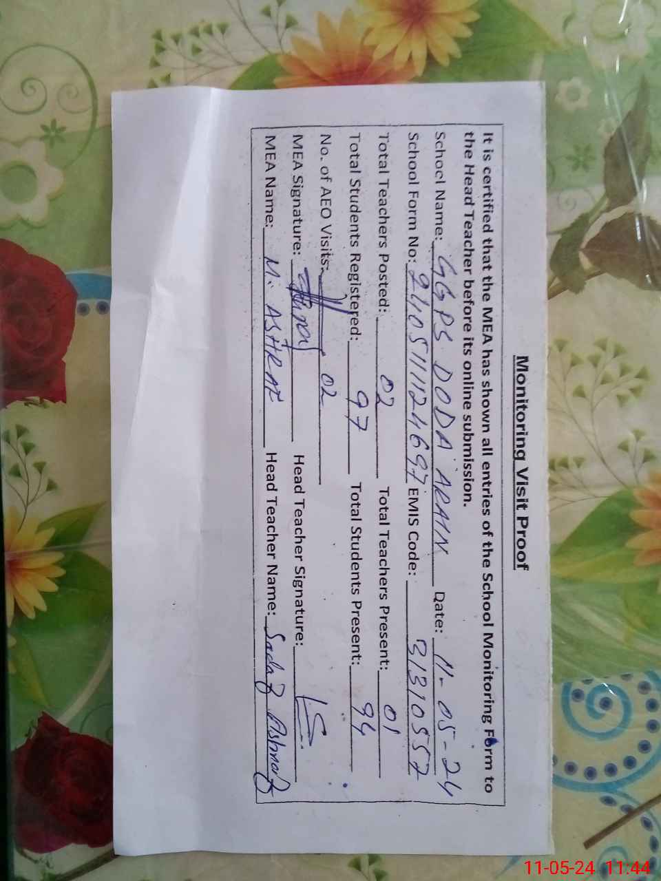 | Attendance Register | Head Teacher | MEA with School | Visit Proof |