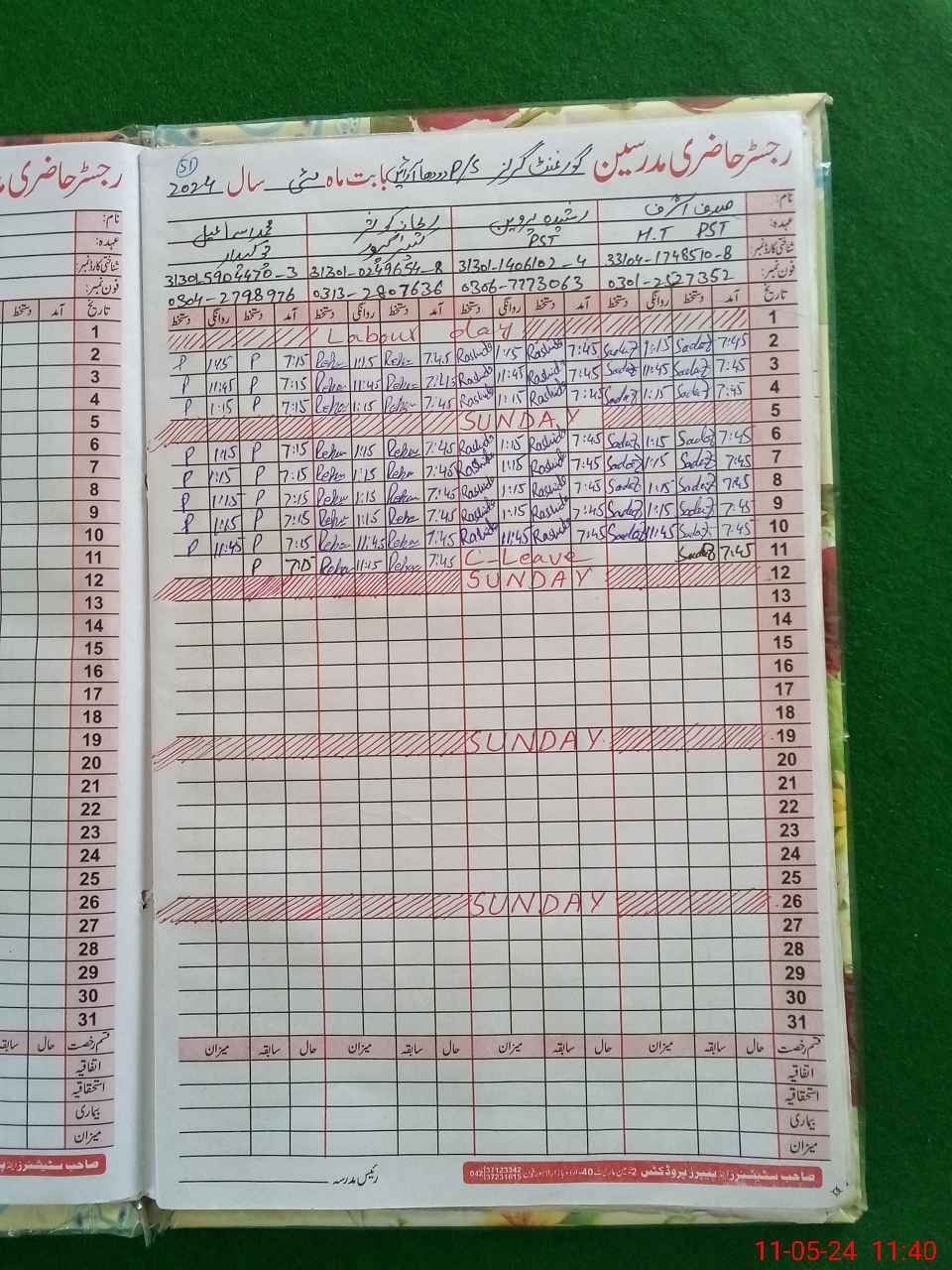 | CNIC | Full Name | Designation | R/C | Absence During Last Calender Month |