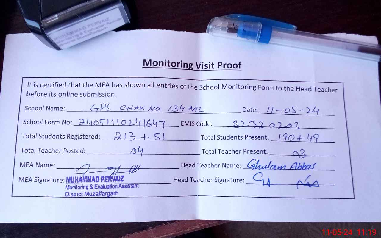 | EMIS Code: 32320203 | Name of School: GES CHAK NO. 134/ML | |||