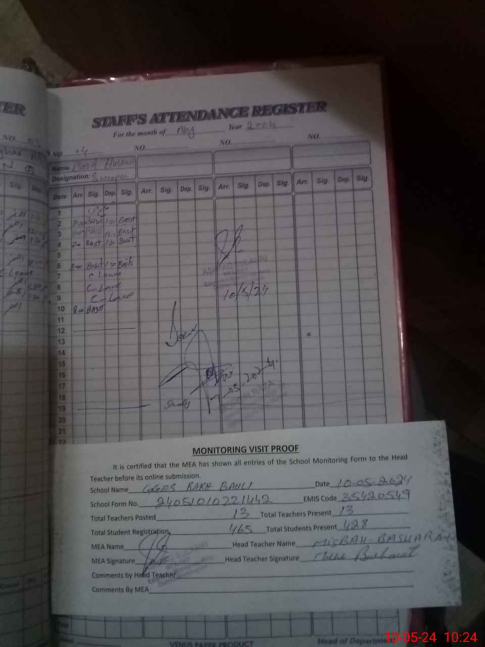 | Monitoring Date: 10-05-2024 | Start Time: 10-05-2024 08:06 AM | End Time: 10-05-2024 10:27 AM | Name of MEA: Mu**** As**** | |