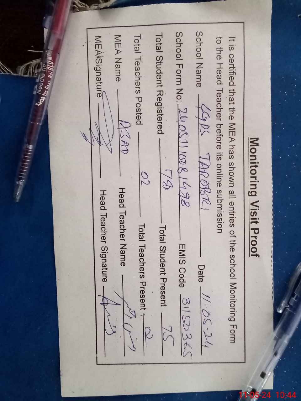 | Attendance Register | Head Teacher | MEA with School | Visit Proof |