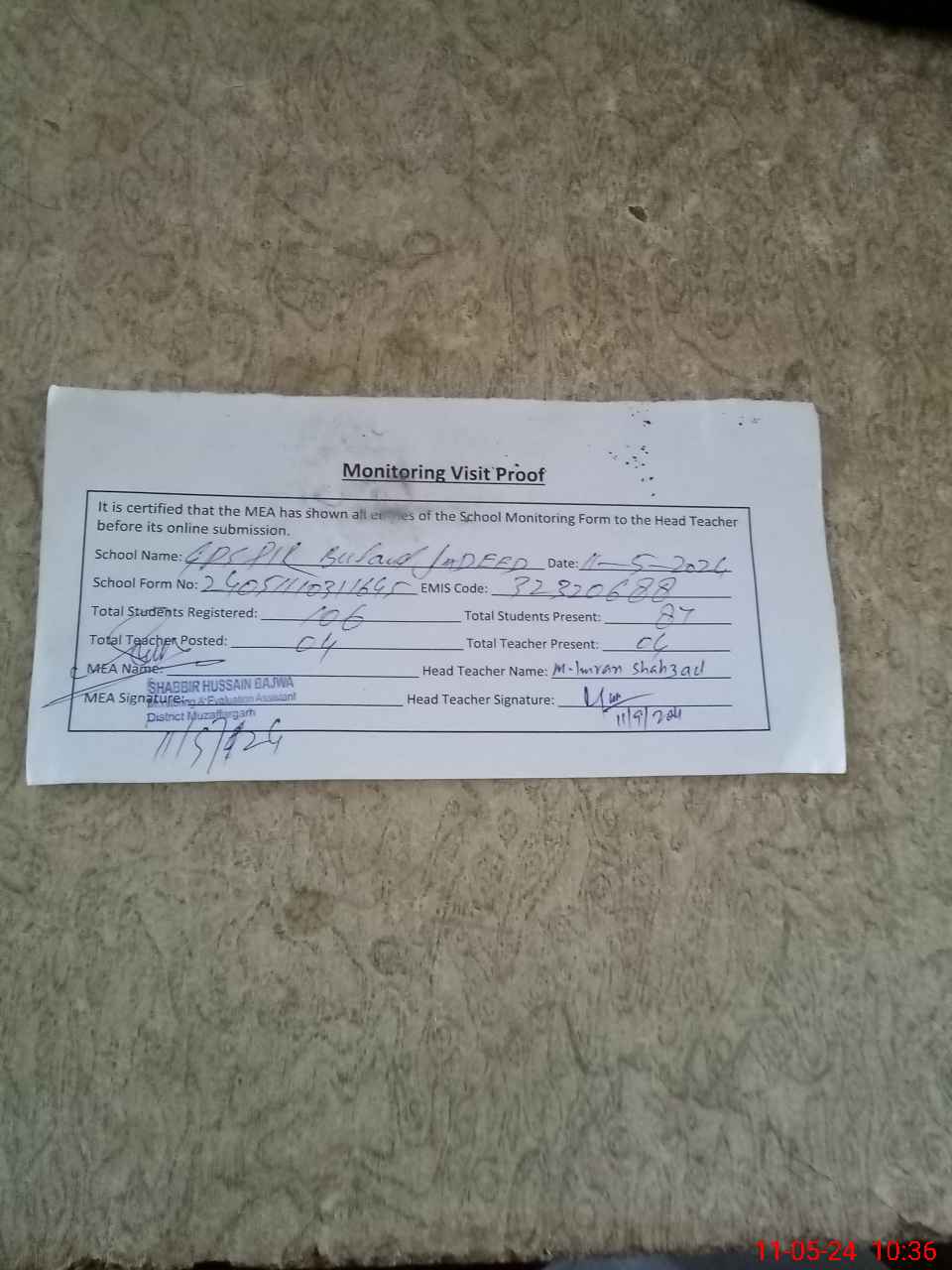 | Attendance Register | Head Teacher | MEA with School | Visit Proof |
