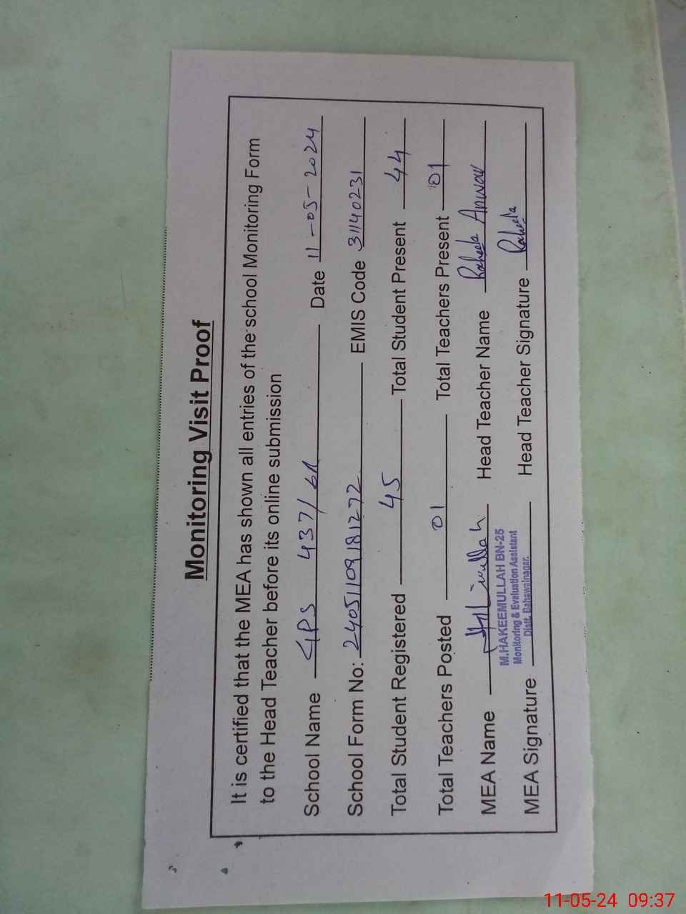 | Attendance Register | Head Teacher | MEA with School | Visit Proof |