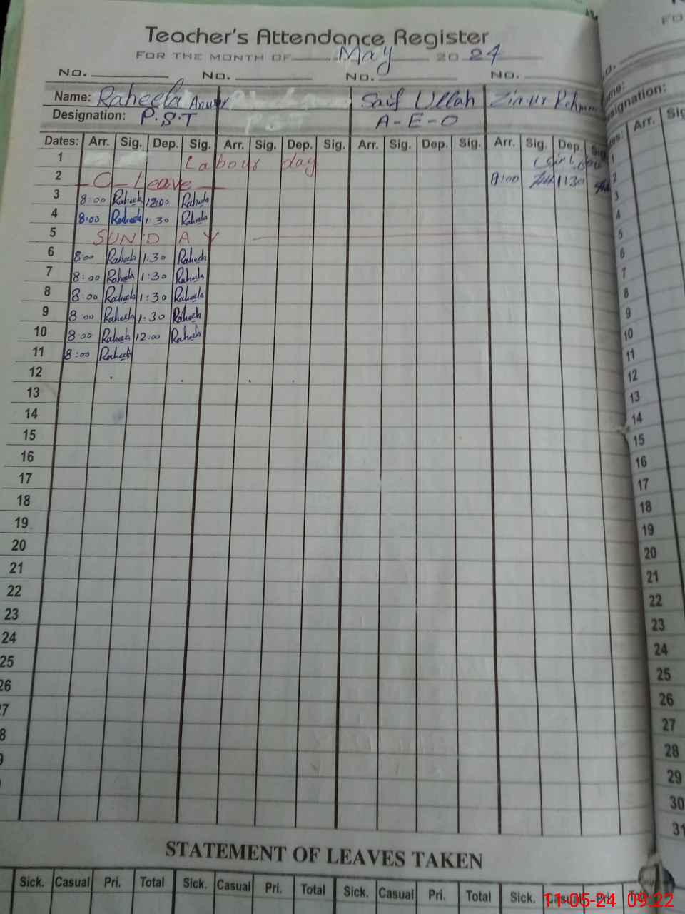 | CNIC | Full Name | Designation | R/C | Absence During Last Calender Month |