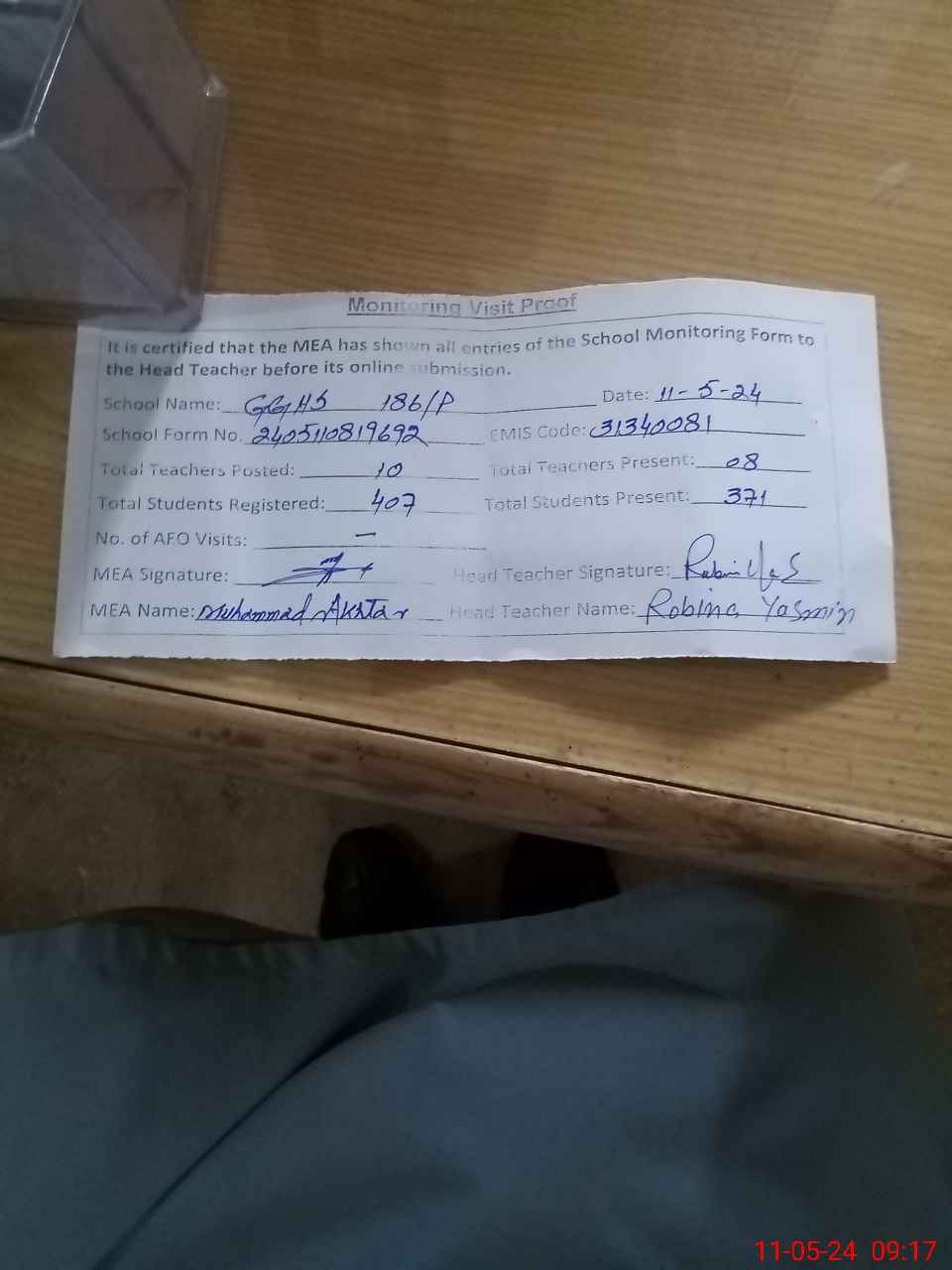 | Monitoring Date: 11-05-2024 | Start Time: 11-05-2024 08:19 AM | End Time: 11-05-2024 09:18 AM | Name of MEA: Mu**** Ak**** | |