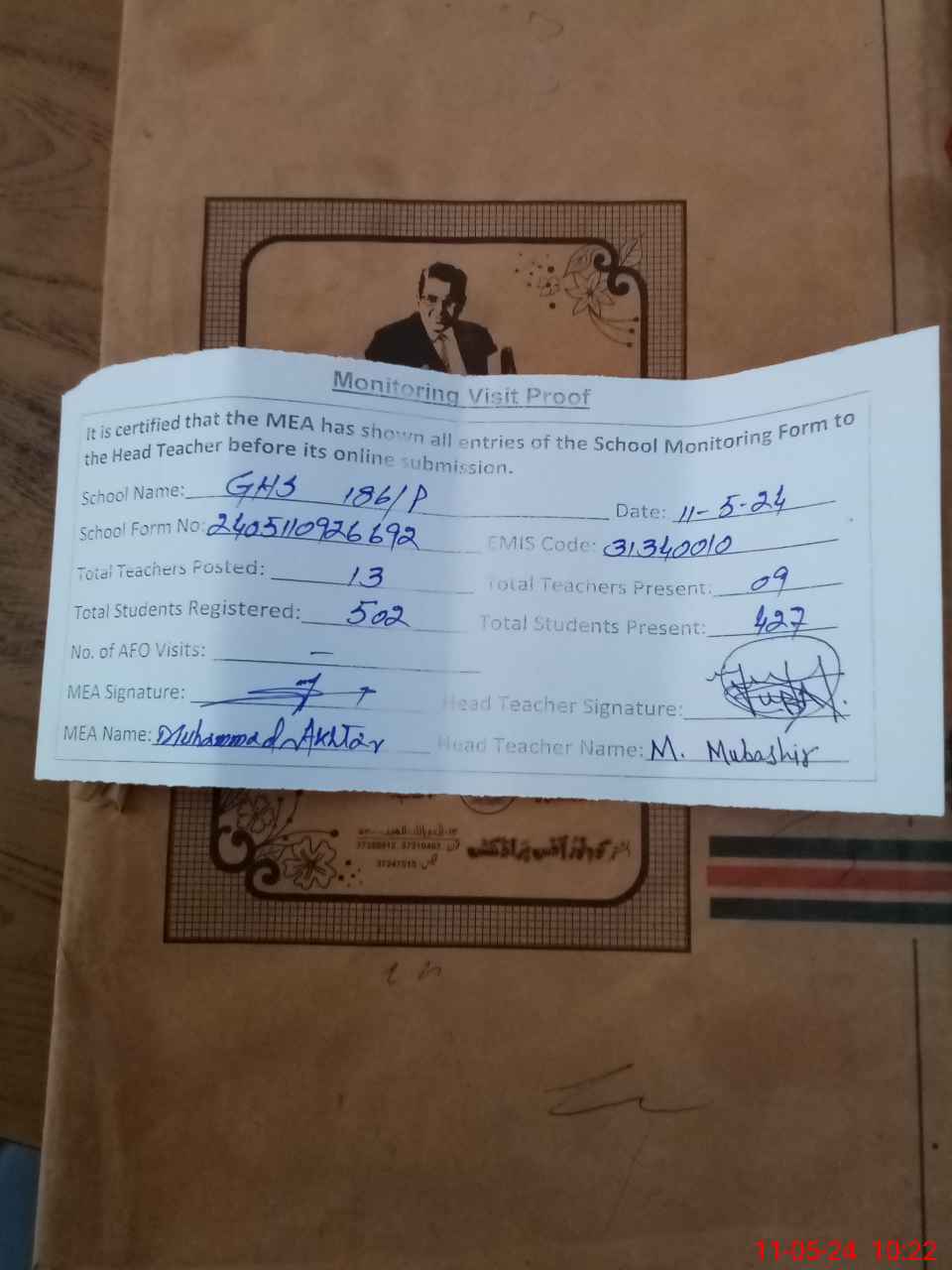 | EMIS Code: 31340010 | Name of School: GHS CHAK 186/P | |||