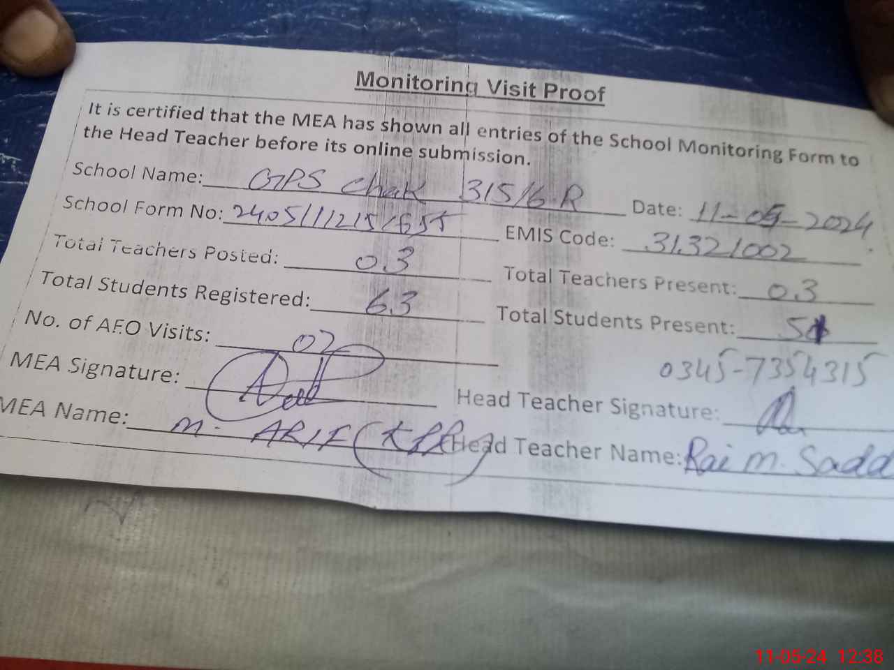 | Name: MU**** SA**** Designation: (School Headmaster's/Headmistress's) PST Phone/Cell Number: 03**** |