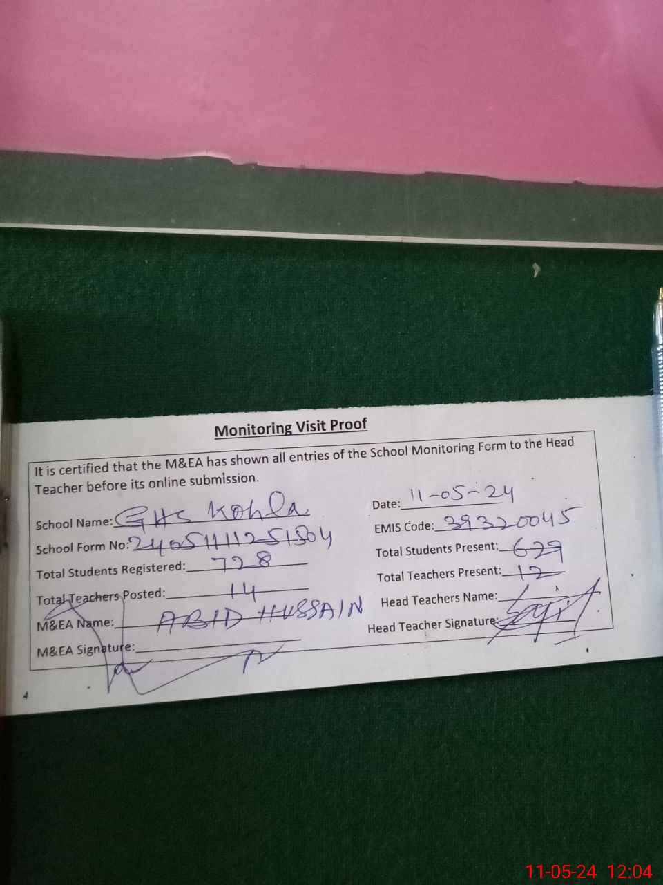 | Attendance Register | Head Teacher | MEA with School | Visit Proof |
