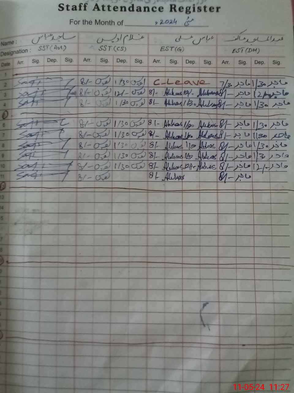 | CNIC | Full Name | Designation | R/C | Absence During Last Calender Month |