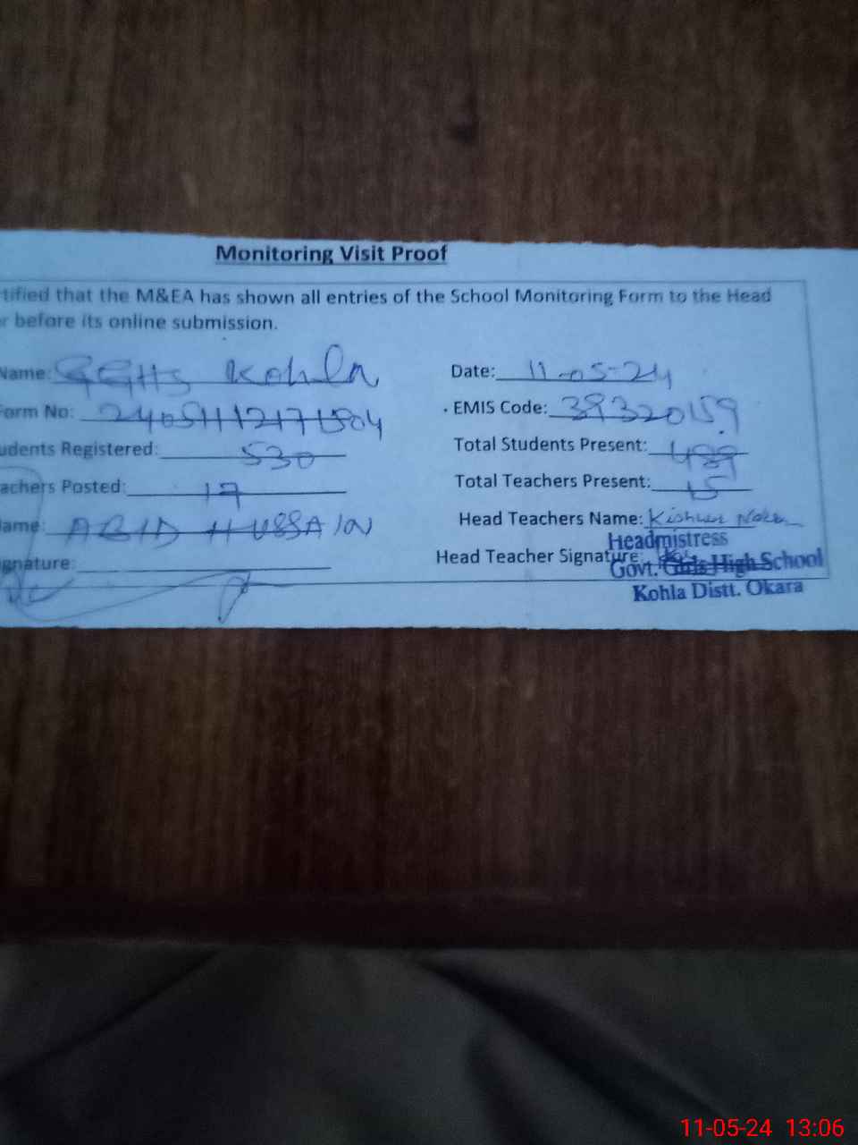 | Name: KI**** NA**** Designation: (School Headmaster's/Headmistress's) S.S.T.(Science) Phone/Cell Number: 03**** |