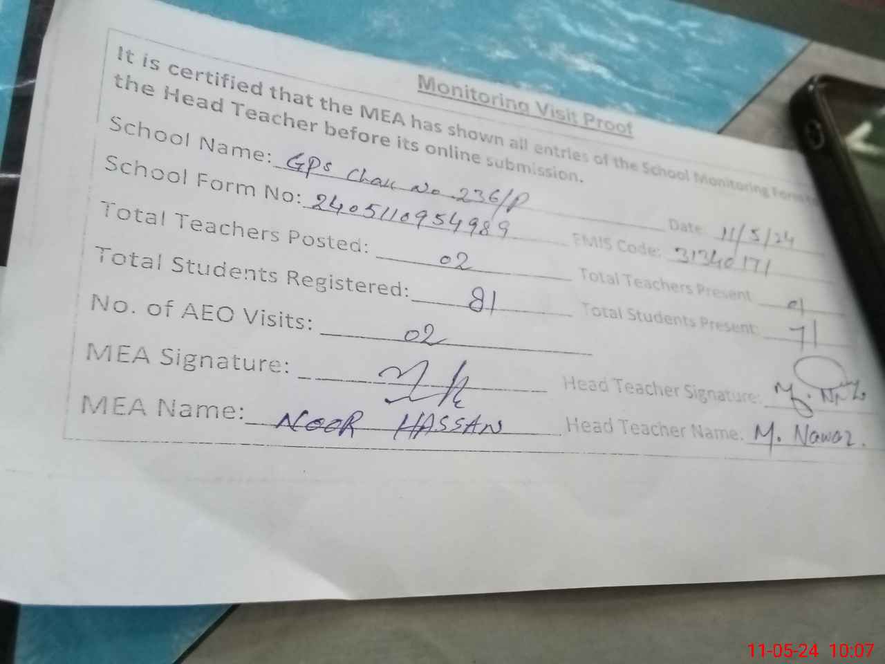 | Attendance Register | Head Teacher | MEA with School | Visit Proof |