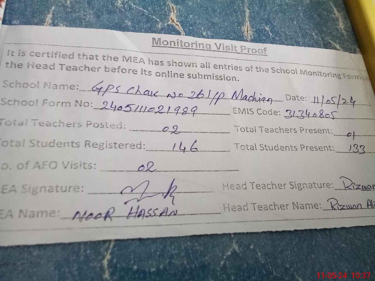 | EMIS Code: 31340805 | Name of School: GPS CHAK NO. 261/P (MACHAIN) | |||