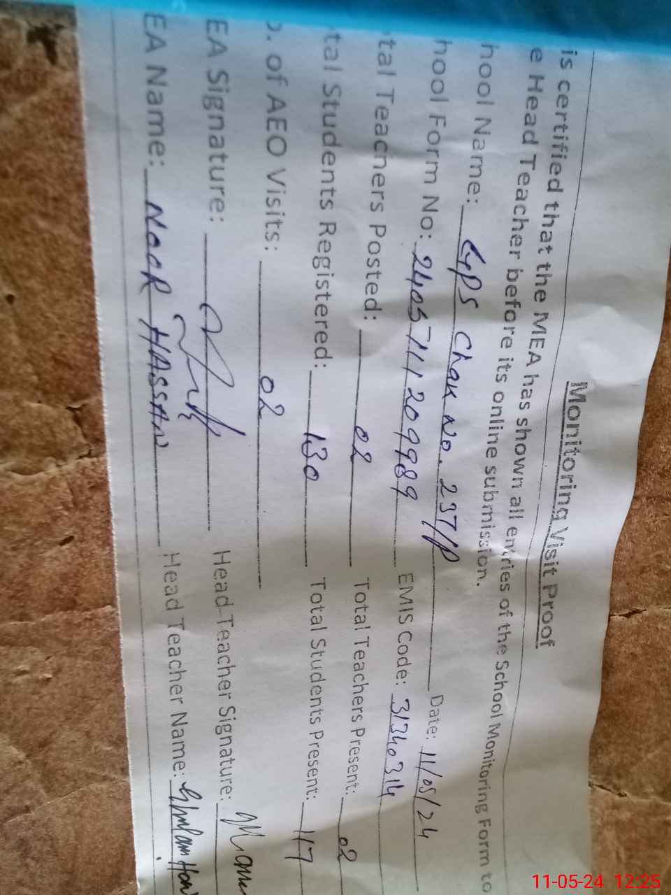 | Attendance Register | Head Teacher | MEA with School | Visit Proof |