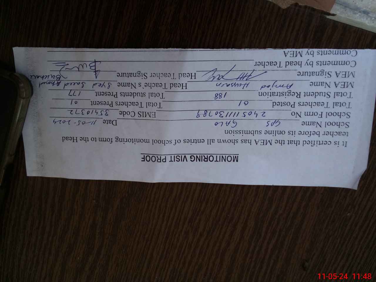 | Attendance Register | Head Teacher | MEA with School | Visit Proof |