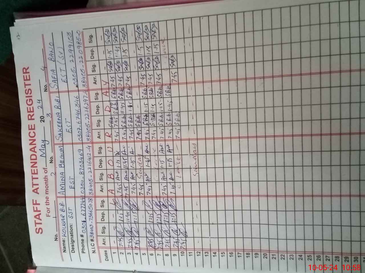 | CNIC | Full Name | Designation | R/C | Absence During Last Calender Month |