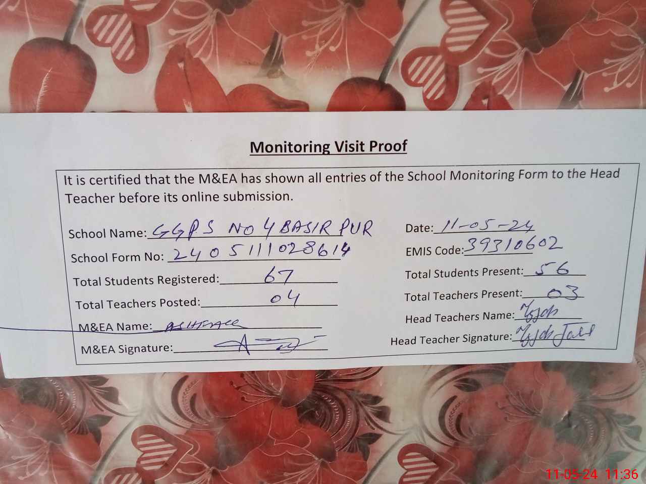 | Attendance Register | Head Teacher | MEA with School | Visit Proof |