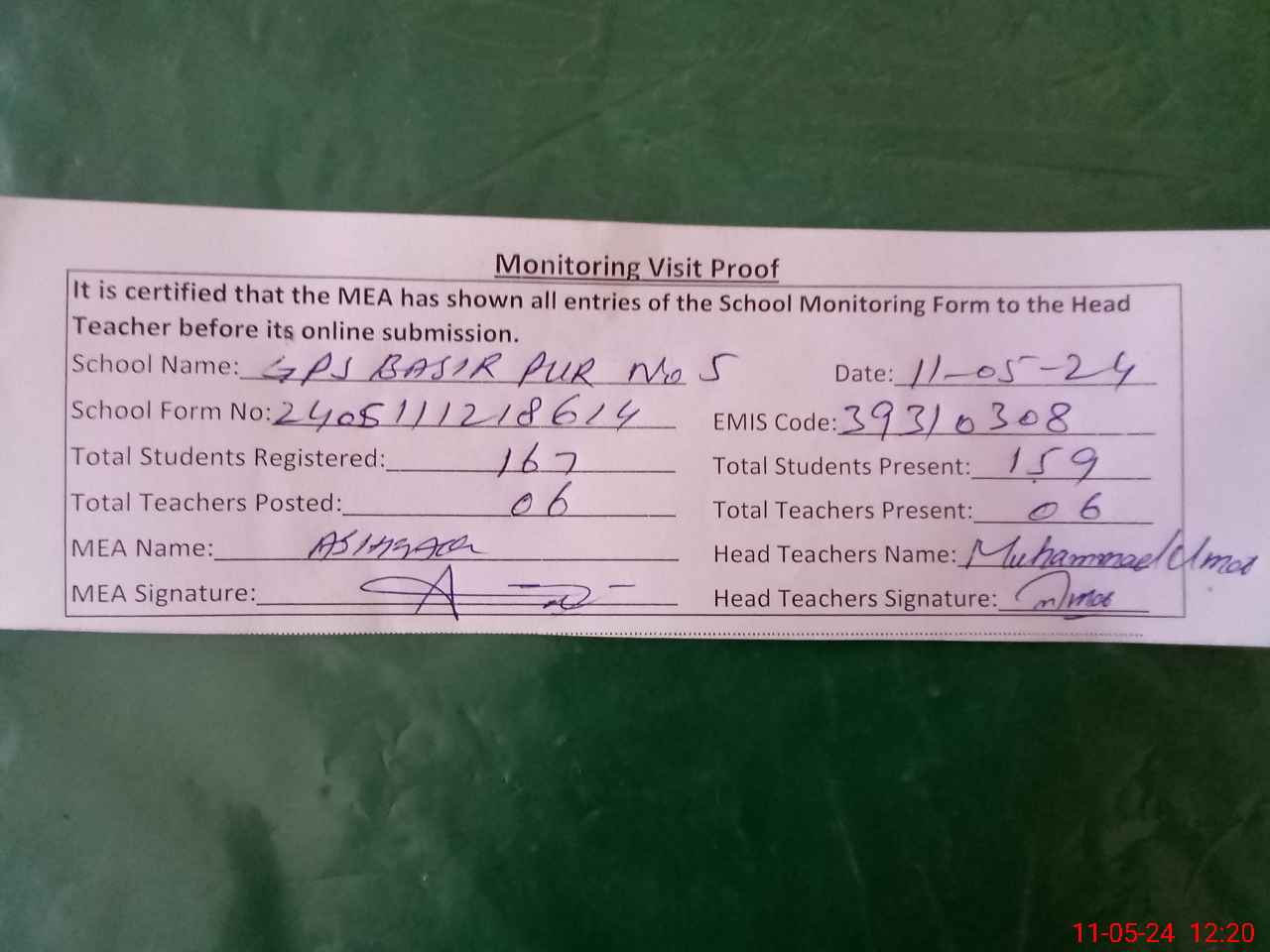 | Attendance Register | Head Teacher | MEA with School | Visit Proof |