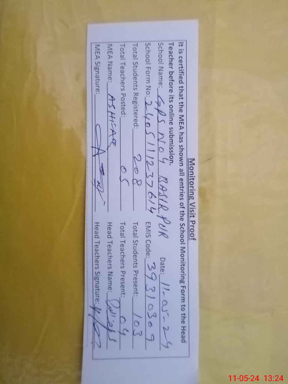 | Attendance Register | Head Teacher | MEA with School | Visit Proof |