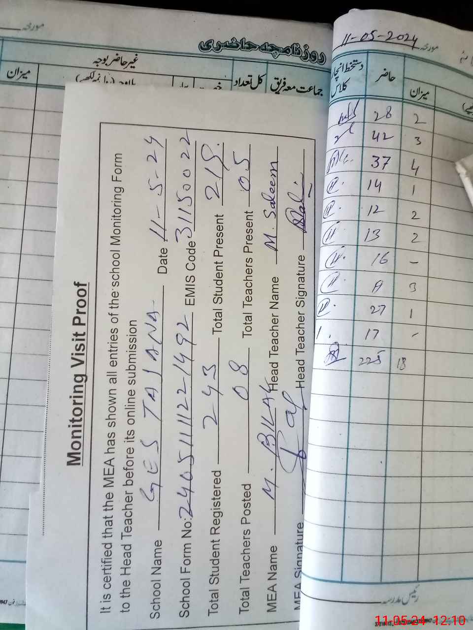 | Attendance Register | Head Teacher | MEA with School | Visit Proof |