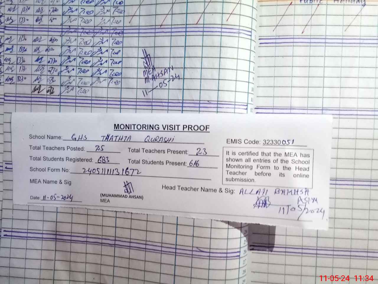 | Attendance Register | Head Teacher | MEA with School | Visit Proof |