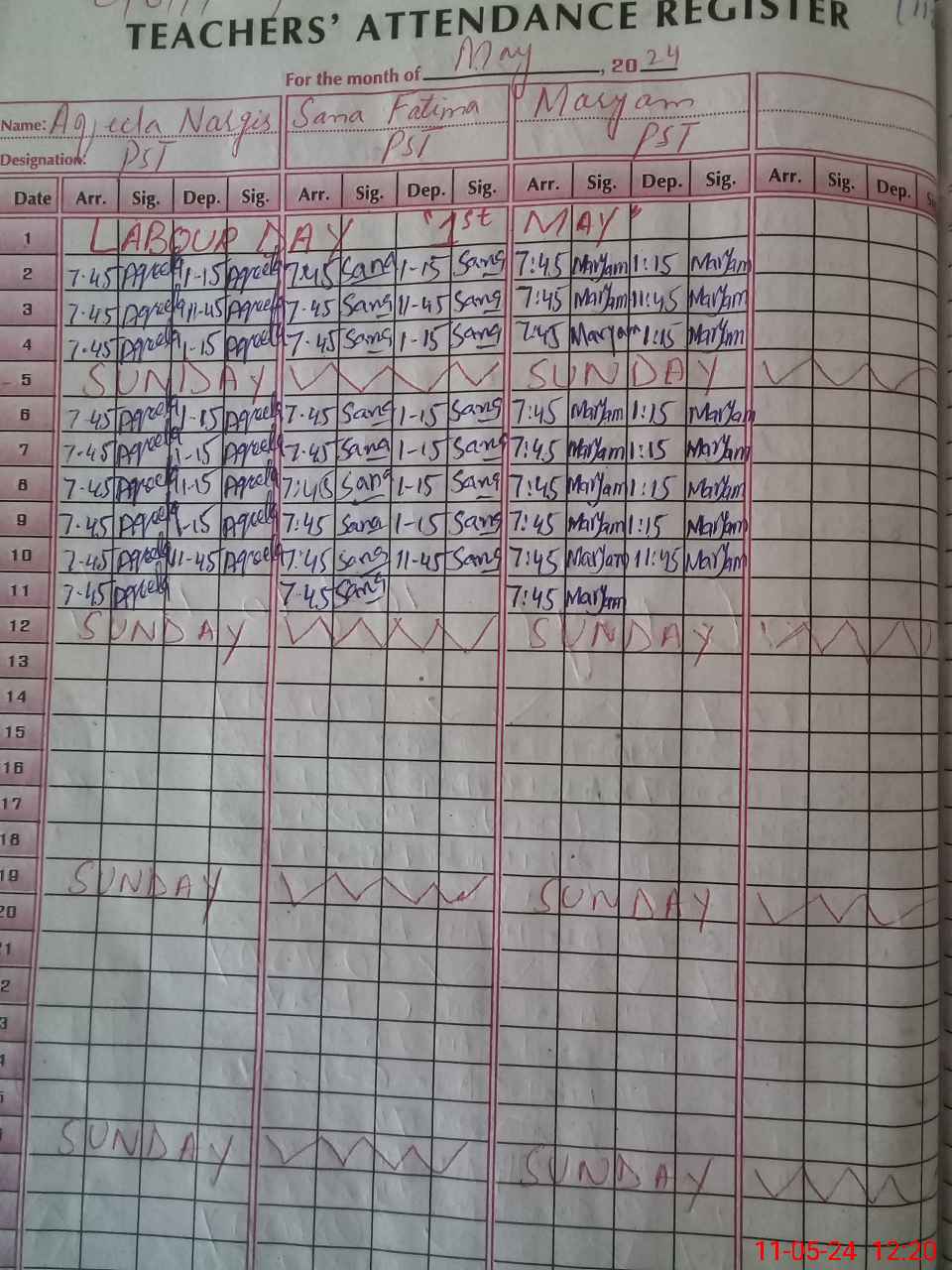| CNIC | Full Name | Designation | R/C | Absence During Last Calender Month |