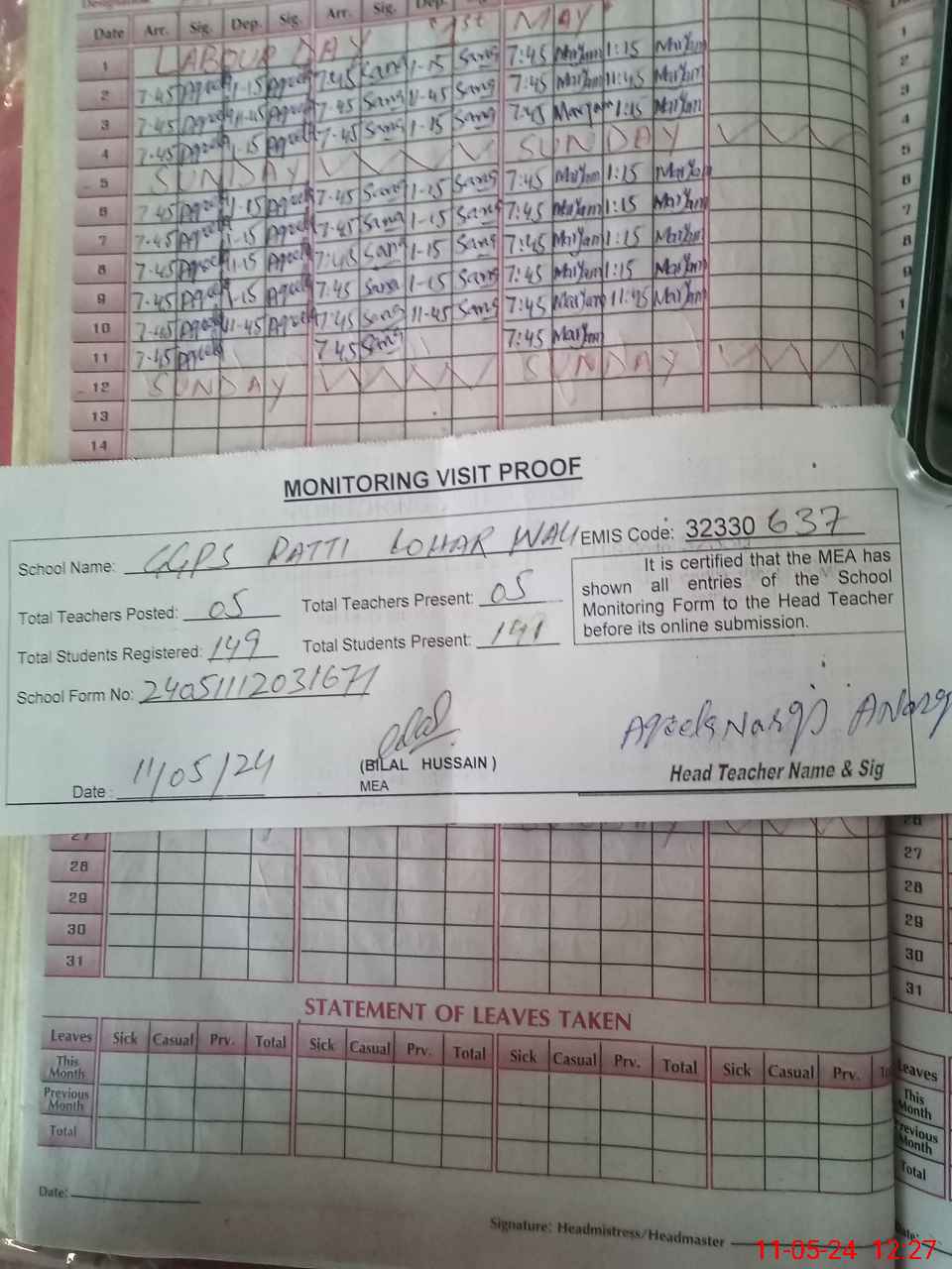 | Attendance Register | Head Teacher | MEA with School | Visit Proof |