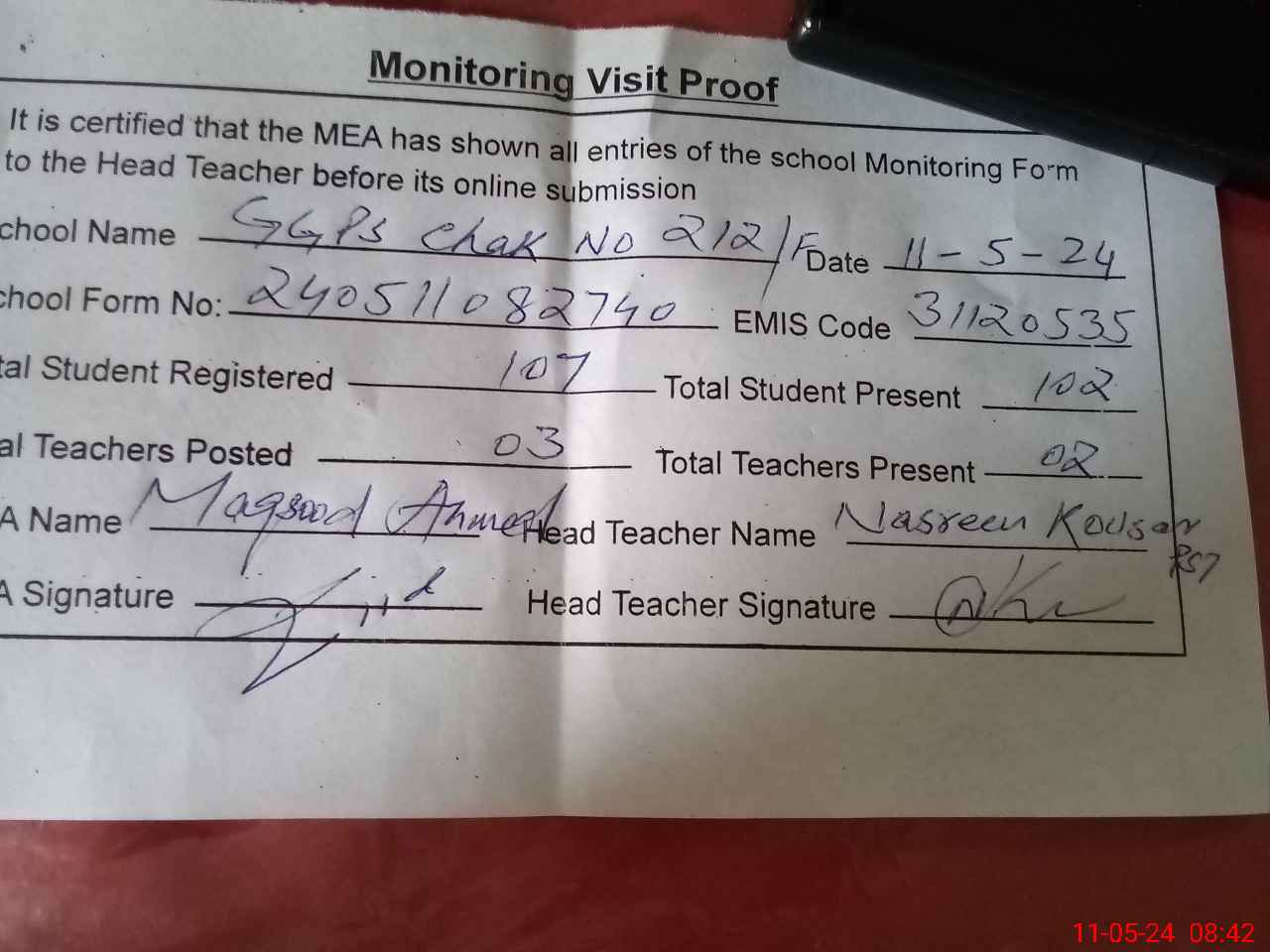 | Attendance Register | Head Teacher | MEA with School | Visit Proof |