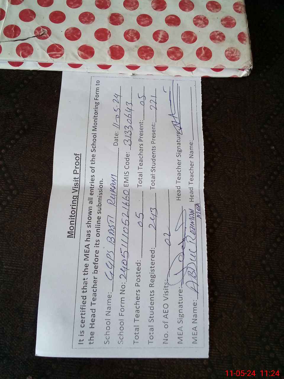| Attendance Register | Head Teacher | MEA with School | Visit Proof |