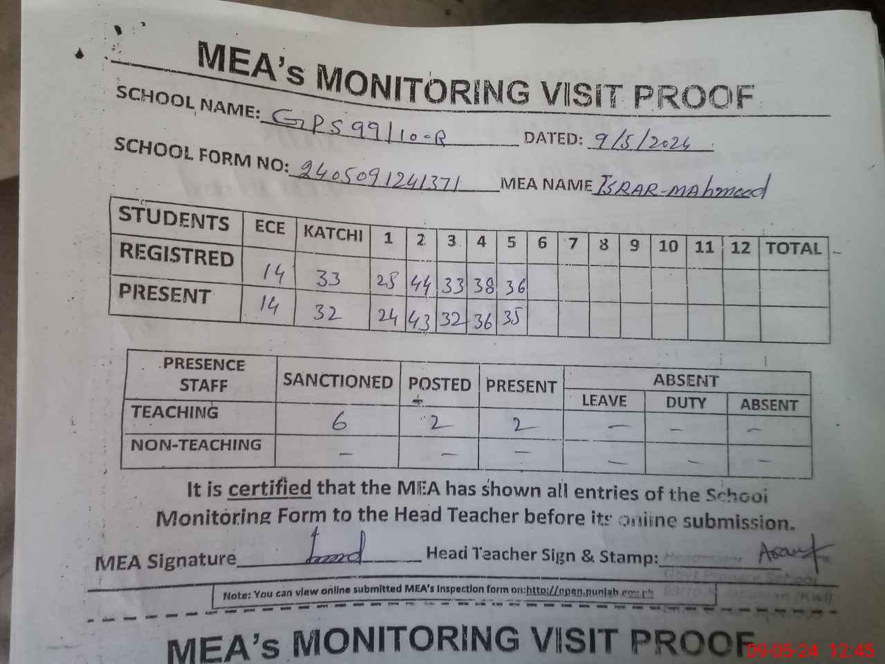 | Attendance Register | Head Teacher | MEA with School | Visit Proof |
