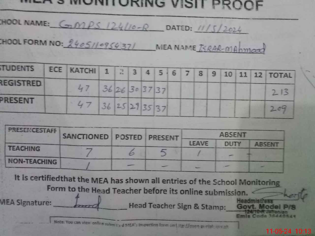| Certified that this School was Inspected by the Undersigned MEA/DMO Today and the Information Stated Above is as Per Record. | |||||
