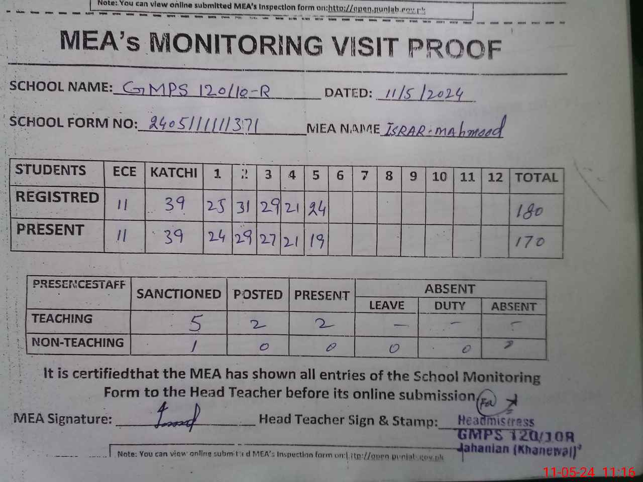 | Attendance Register | Head Teacher | MEA with School | Visit Proof |
