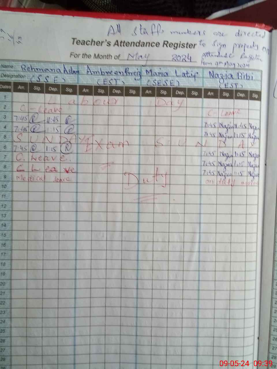 | CNIC | Full Name | Designation | R/C | Absence During Last Calender Month |
