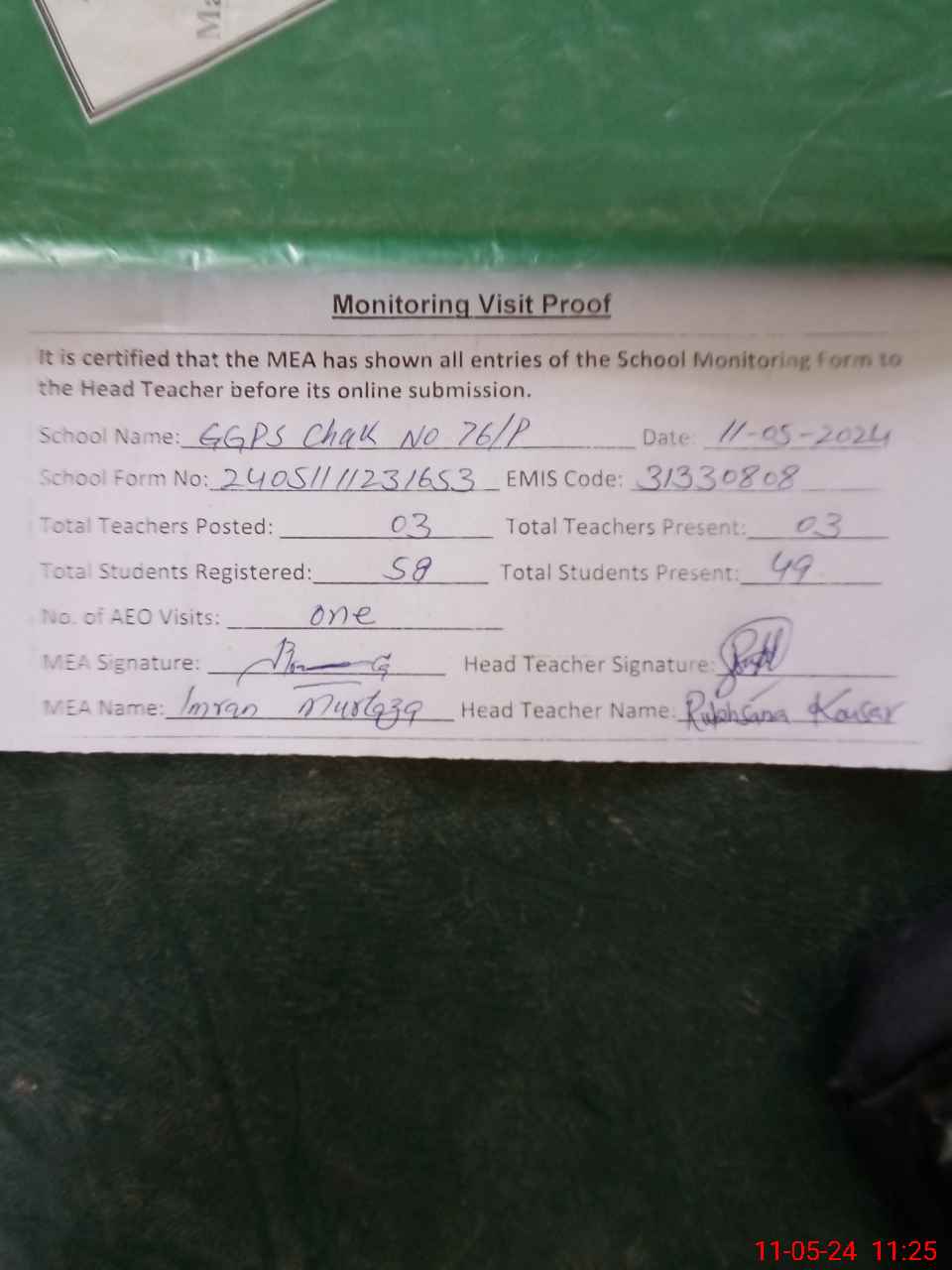 | Attendance Register | Head Teacher | MEA with School | Visit Proof |