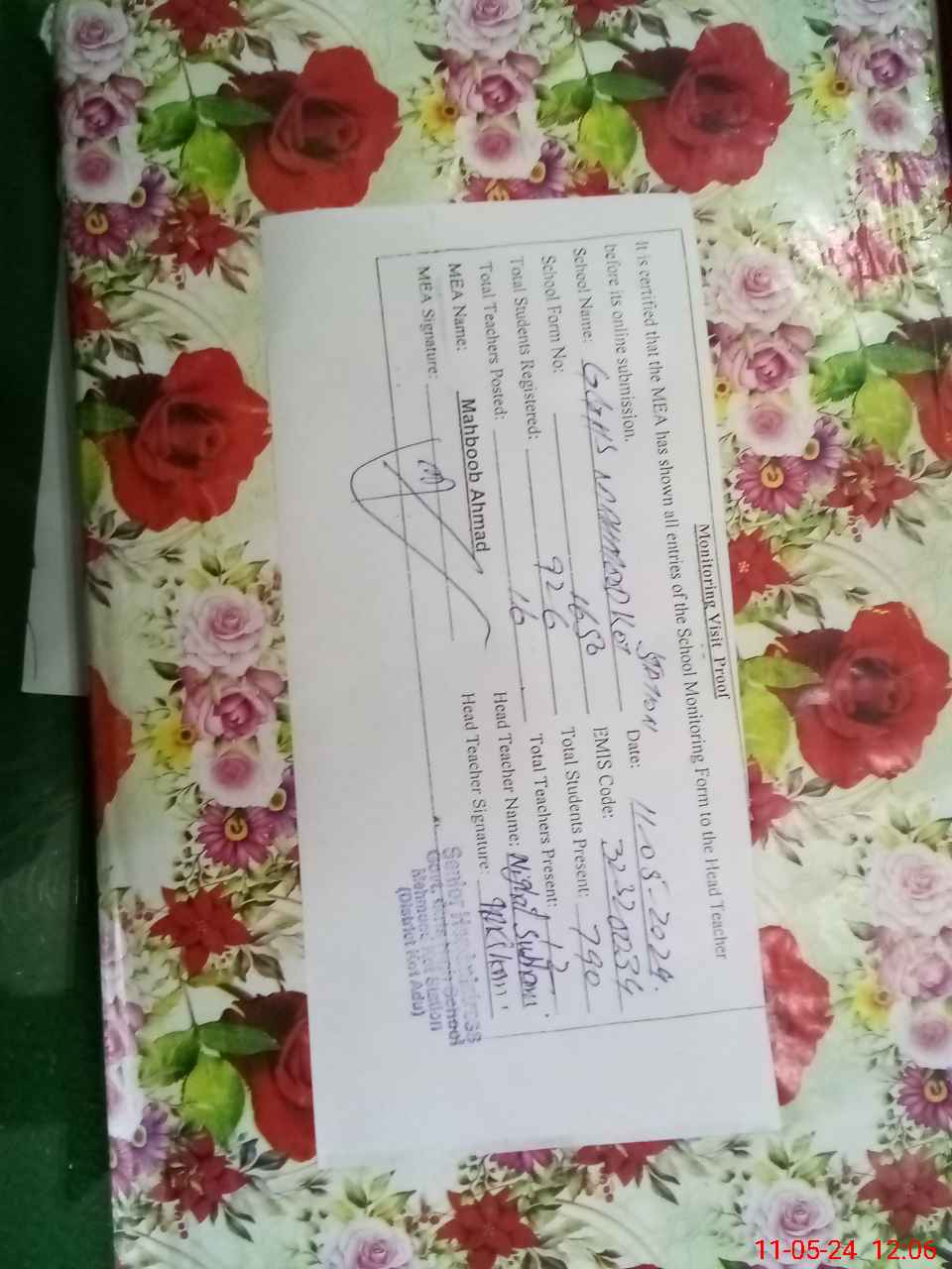 | Certified that this School was Inspected by the Undersigned MEA/DMO Today and the Information Stated Above is as Per Record. | |||||