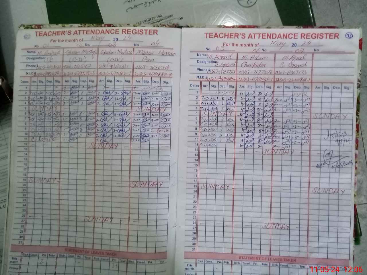 | CNIC | Full Name | Designation | R/C | Absence During Last Calender Month |