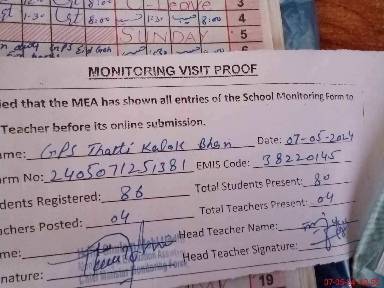| Attendance Register | Head Teacher | MEA with School | Visit Proof |