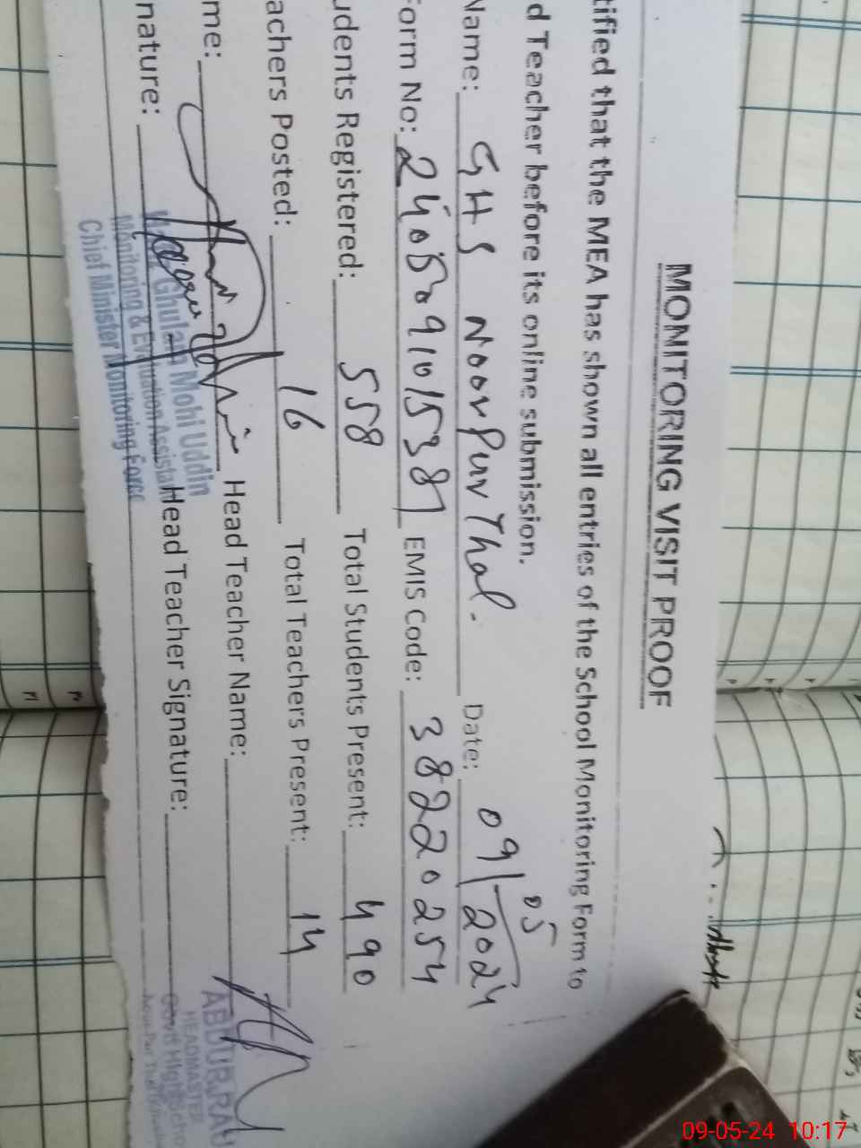 | Monitoring Date: 09-05-2024 | Start Time: 09-05-2024 09:59 AM | End Time: 09-05-2024 10:32 AM | Name of MEA: HA**** GH**** MO**** UDDI**** | |