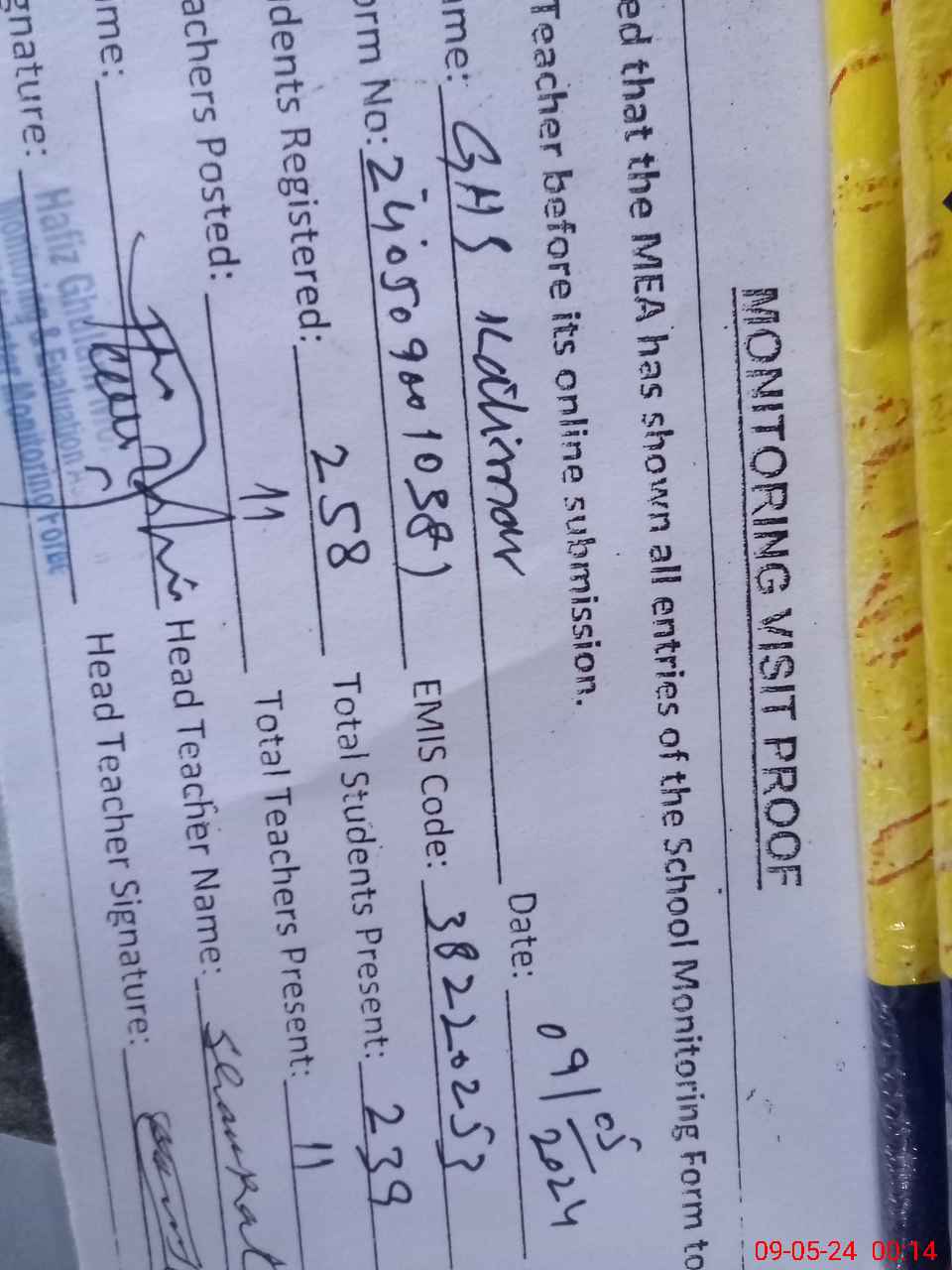 | Attendance Register | Head Teacher | MEA with School | Visit Proof |