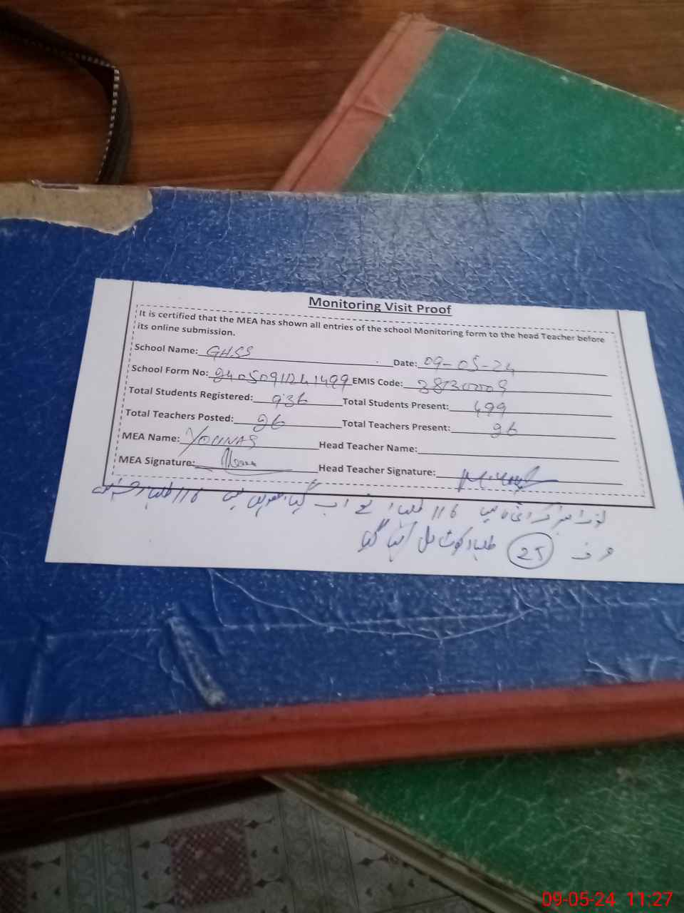 | Attendance Register | Head Teacher | MEA with School | Visit Proof |