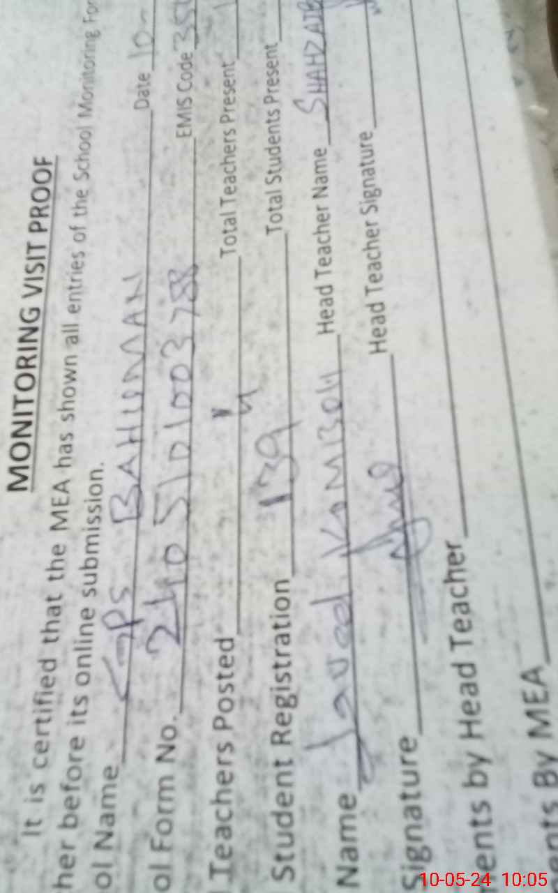 | Name: Sh**** Mu**** Designation: (School Headmaster's/Headmistress's) PST Phone/Cell Number: 03**** |
