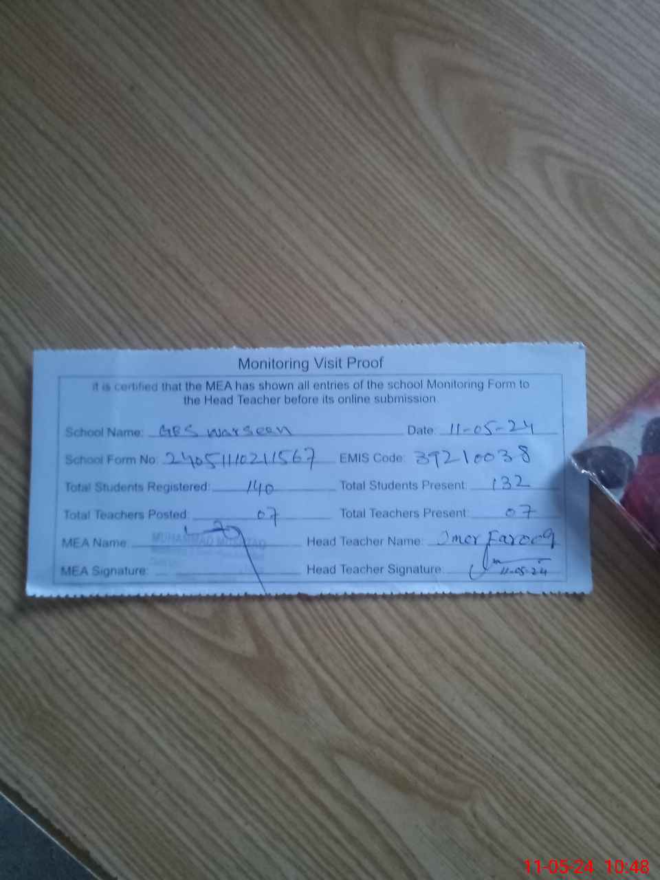 | Attendance Register | Head Teacher | MEA with School | Visit Proof |