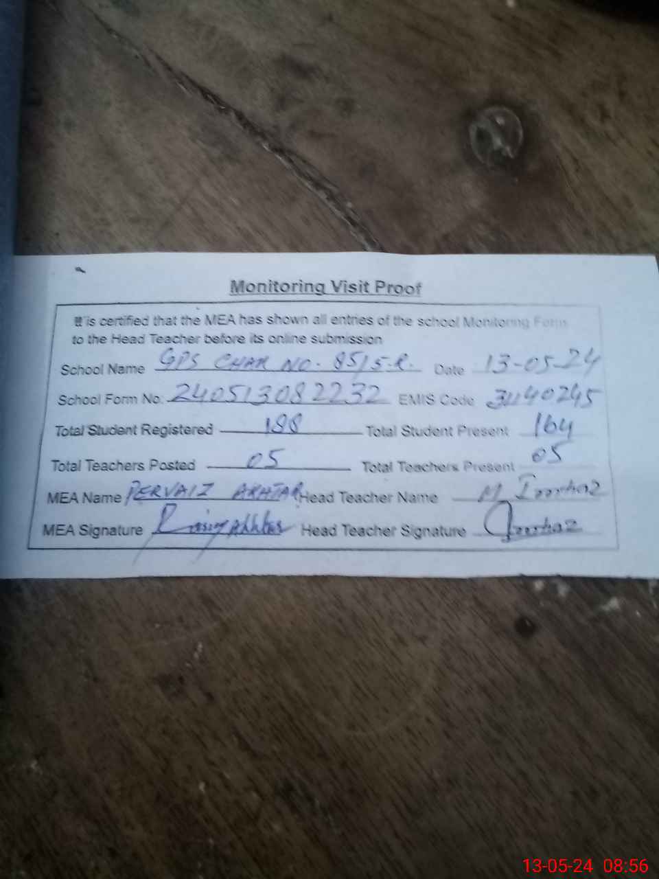 | Attendance Register | Head Teacher | MEA with School | Visit Proof |