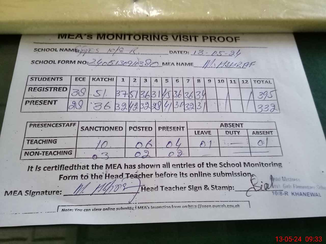 | Attendance Register | Head Teacher | MEA with School | Visit Proof |
