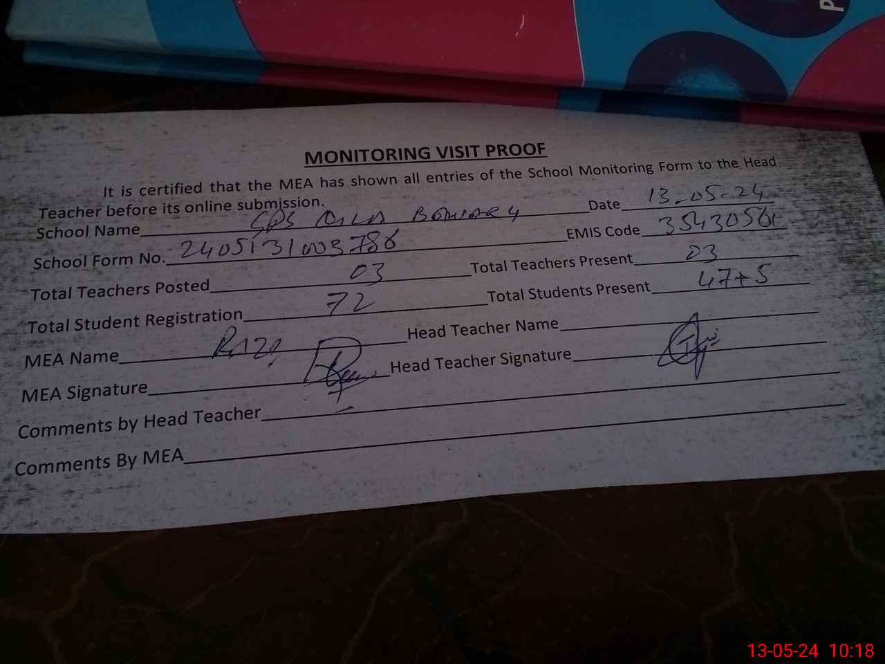 | Attendance Register | Head Teacher | MEA with School | Visit Proof |