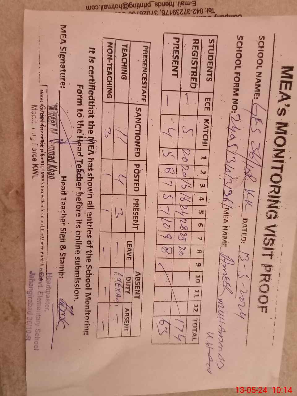 | Certified that this School was Inspected by the Undersigned MEA/DMO Today and the Information Stated Above is as Per Record. | |||||