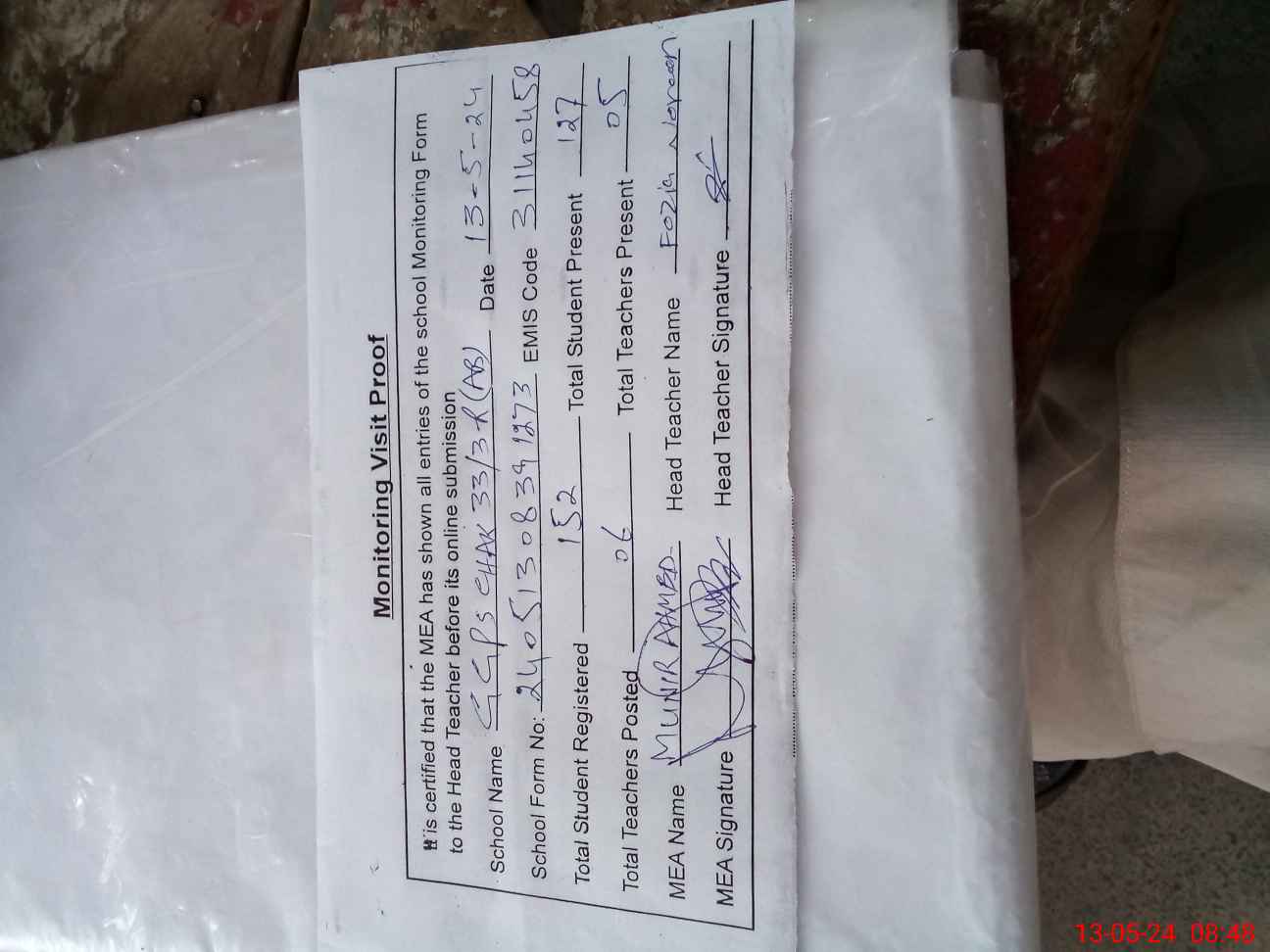 | Attendance Register | Head Teacher | MEA with School | Visit Proof |