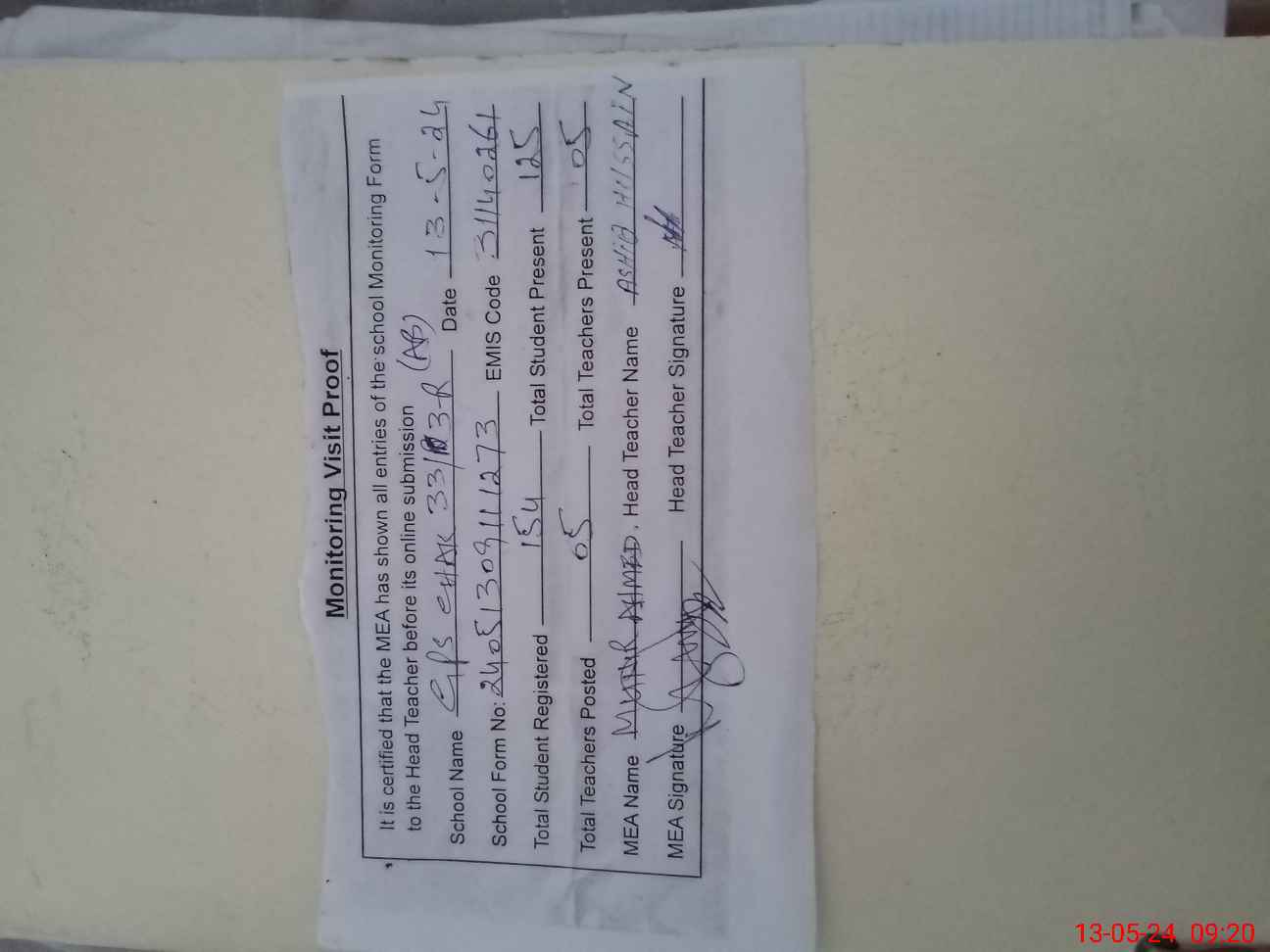 | Attendance Register | Head Teacher | MEA with School | Visit Proof |