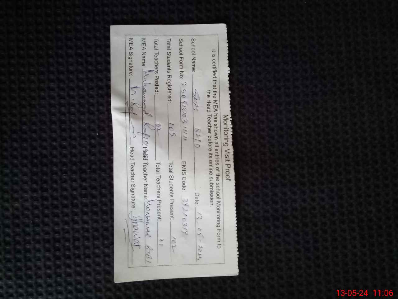 | Attendance Register | Head Teacher | MEA with School | Visit Proof |
