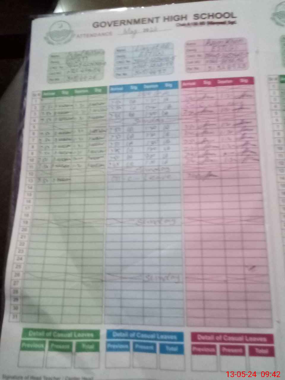 | CNIC | Full Name | Designation | R/C | Absence During Last Calender Month |