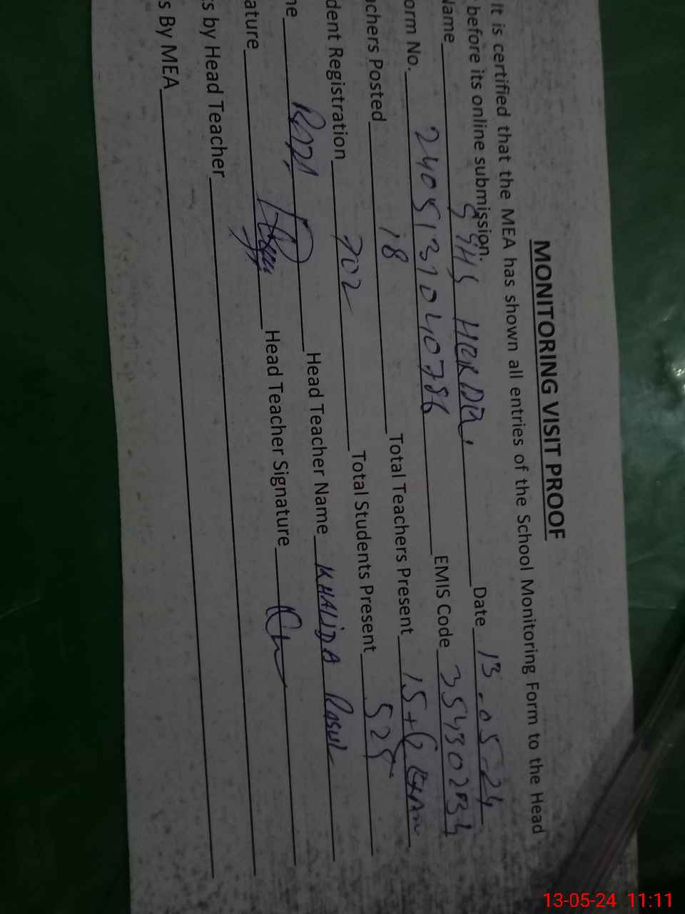 | Attendance Register | Head Teacher | MEA with School | Visit Proof |